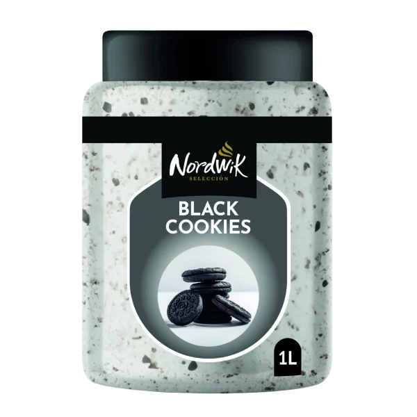 Frozen black cookies from Spain, 110 ml per unit, 18 units per case. Ideal for retail bakery and frozen dessert sections.