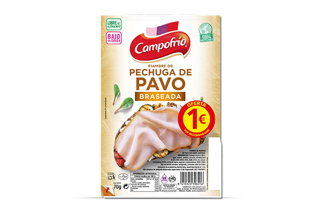 Braised turkey breast (49%) and chicken breast (11%) cold cut with natural flavors, stabilizers, smoked aroma, spices, and preservatives. Ready to enjoy.