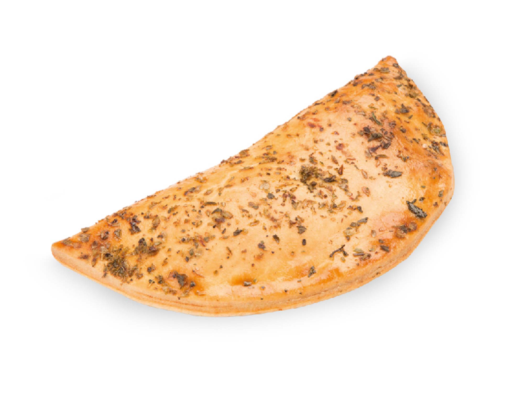 Frozen calzone with wheat flour dough filled with tomato, cheese flavor, melted cheese, pork lard, and egg.