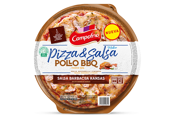 Pizza with wheat and rye flour dough, topped with chicken breast, pork bacon, mozzarella cheese, and Kansas City style barbecue sauce.