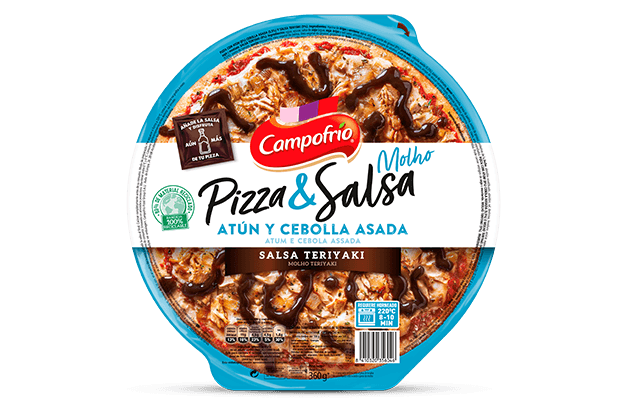 100g pizza with 8% tuna in sunflower oil, 5.5% roasted onion, mozzarella cheese, tomato paste, and 9% teriyaki sauce.